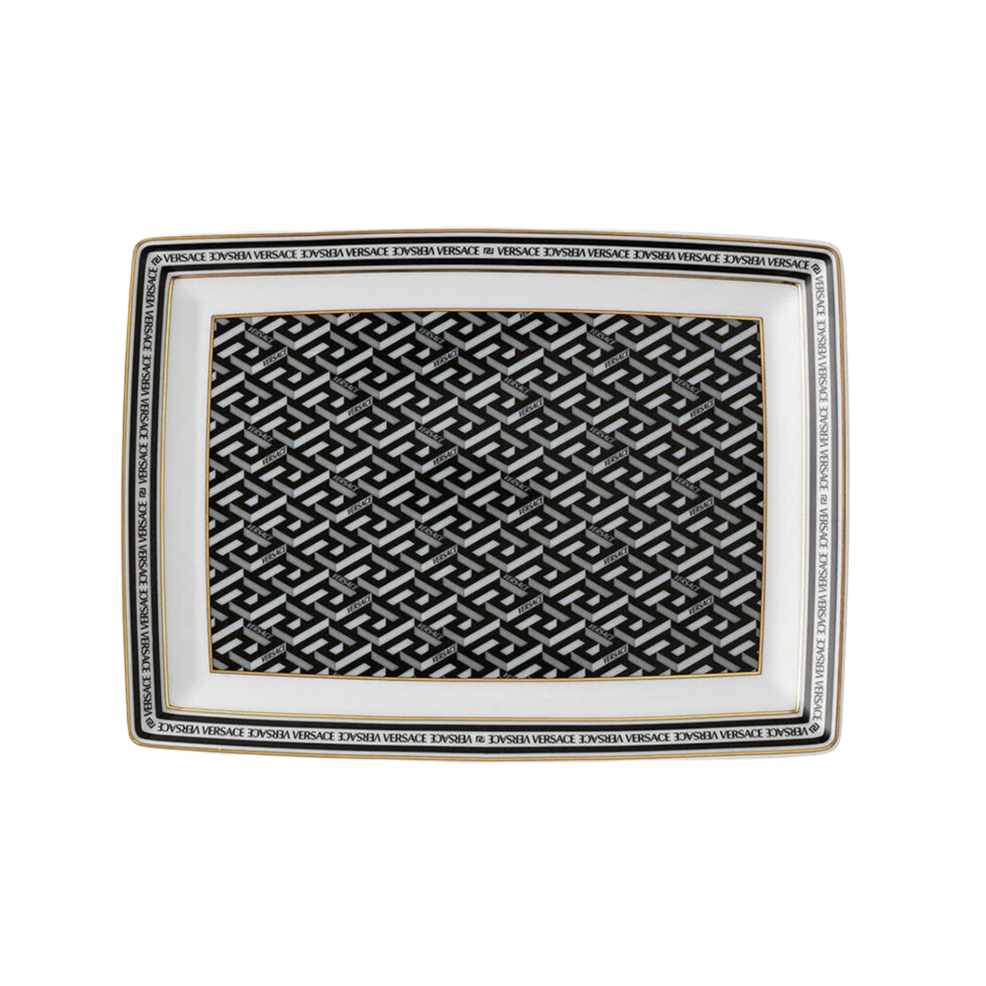 A refined rectangular platter cast in black porcelain, this piece carries the iconic La Greca motif in three-dimensional relief. The geometric design, a signature Versace pattern, gives the plate sculptural depth, while the Versace logo subtly accents the rim. According to Rosenthal, the design is food safe and intended for occasional or decorative use.